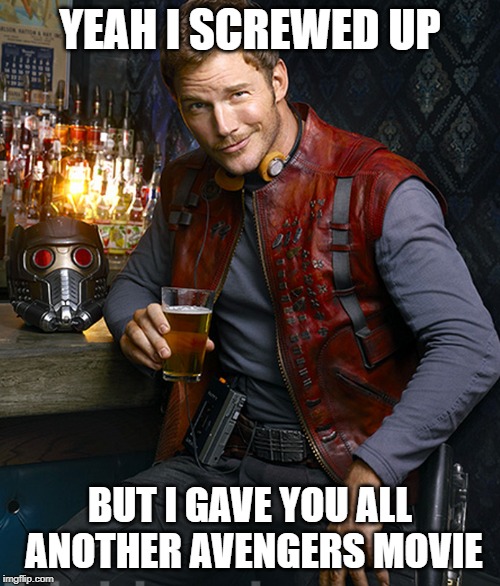 Here we have a picture of Peter Quill, also known as Star-Lord, from Guardians of the Galaxy. Here I gave him a caption about how he is the reason there was another avengers movie after the film, Avengers: Infinity War. I based it off this image here: (https://knowyourmeme.com/photos/1472959-avengers-endgame ).